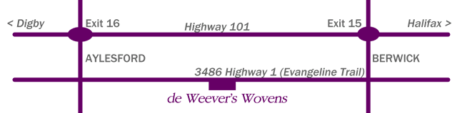De Weever’s Wovens is located at 3486 Highway #1, between Aylesford and Berwick, in the picturesque Annapolis Valley of Nova Scotia.